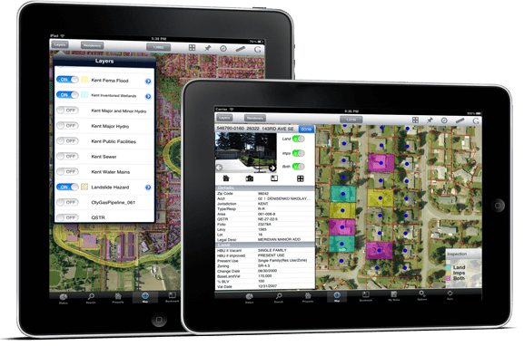The King County Department of Assessments chose the iPad to simplify and streamline field work. Now, with a simple tap of the finger, photos and data can be quickly reviewed and aerial and Google maps accessed. With simple drop down menus, data can be entered without typing. Horizontal tabs display the property and building information as well as historical values. Qualifying searches can be made and data filtered. The built in camera allows photos to be taken and attached immediately to the parcel, saving time and effort. Built in GPS capabilities allow appraisers to know where they are for accurate measurement and the screen offers great visibility.