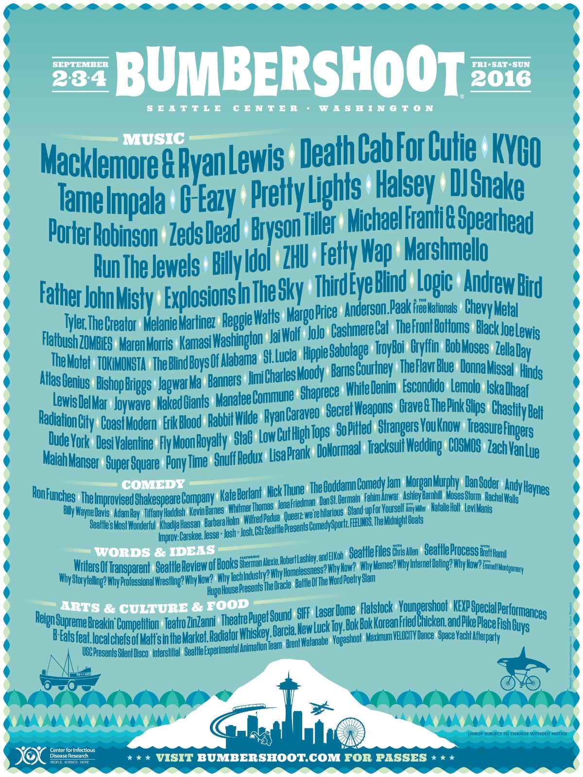 Seattle-based nonprofit Center for Infectious Disease Research (CIDResearch) is the official non-profit partner of Bumbershoot 2016. As part of the relationship, Bumbershoot will donate a portion of each pass sold and encourage fans to donate as well, helping spread global health awareness.